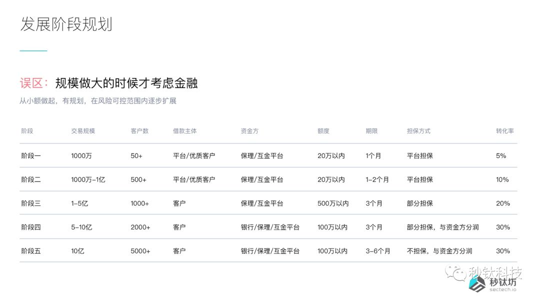 我们有一个误区,认为在业务规模做大的时候才考虑金融。我们需要纠正这个误区,从小额做起,有规划在风险可控的范围内逐步扩展。金融是一项长期的工程,风险表现需要至少沉淀三个周期以上才算稳定,平台成立之初就应该规划好金融路径并推向市场去不断的调整金融产品和风控模型。