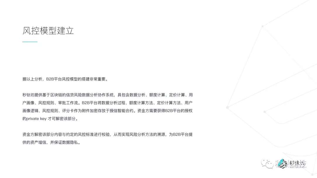 B2B平台将数据分析过程、额度计算方法、定价计算方法、用户的画像逻辑、风控规则、评分卡作为附件加密存放在授信的智能合约里面。资金方需要获得B2B平台的授权或者是用户的授权才可解密该部分。资金方解密该部分的内容约定的风控标准进行校验。从而实现风险分析方法的溯源,为B2B平台提供的资产增信。并保证数据的隐私。